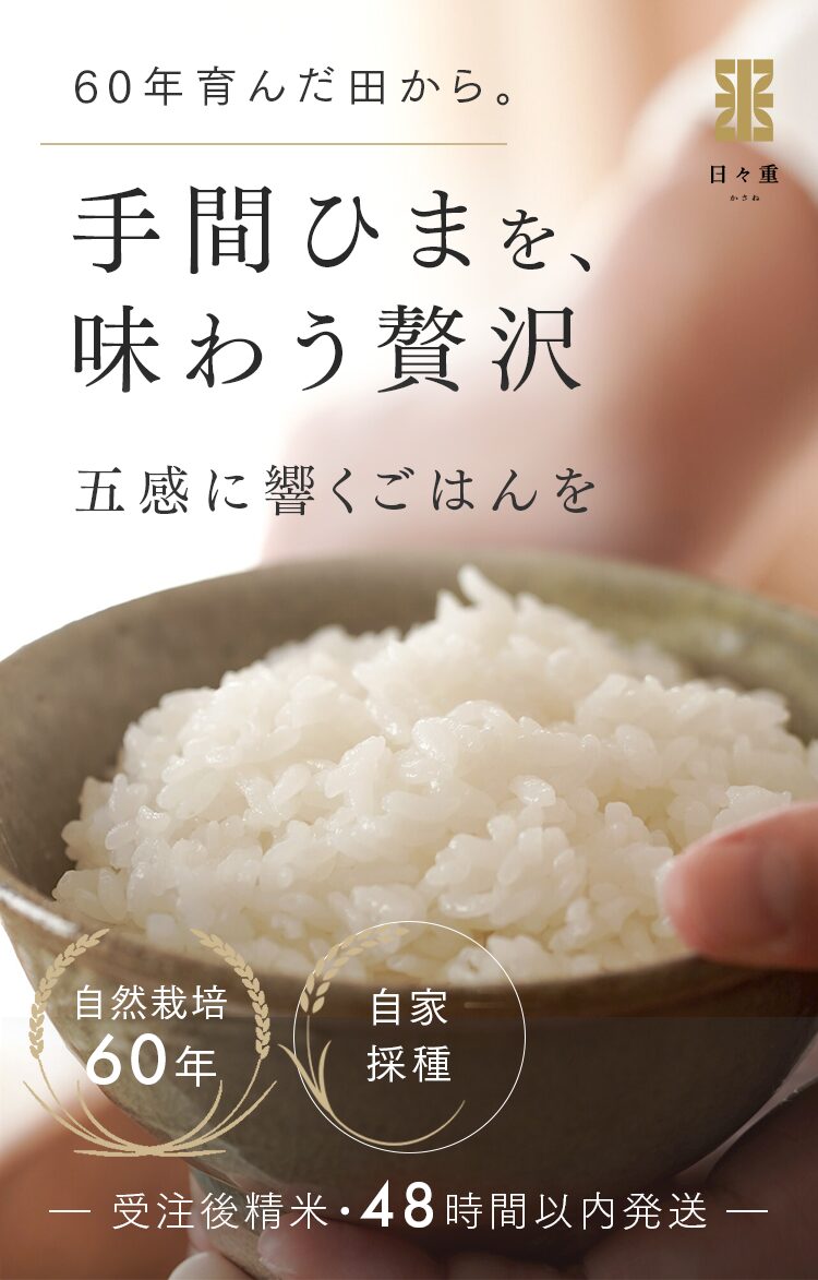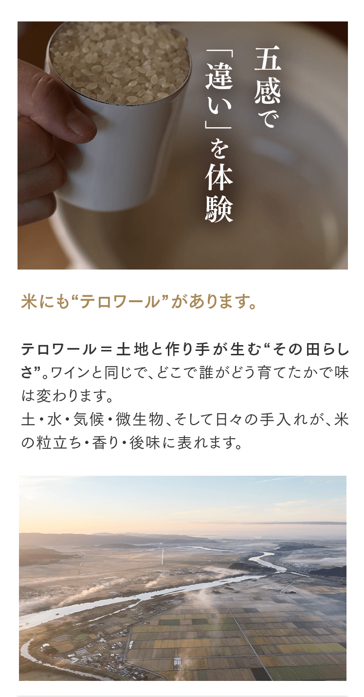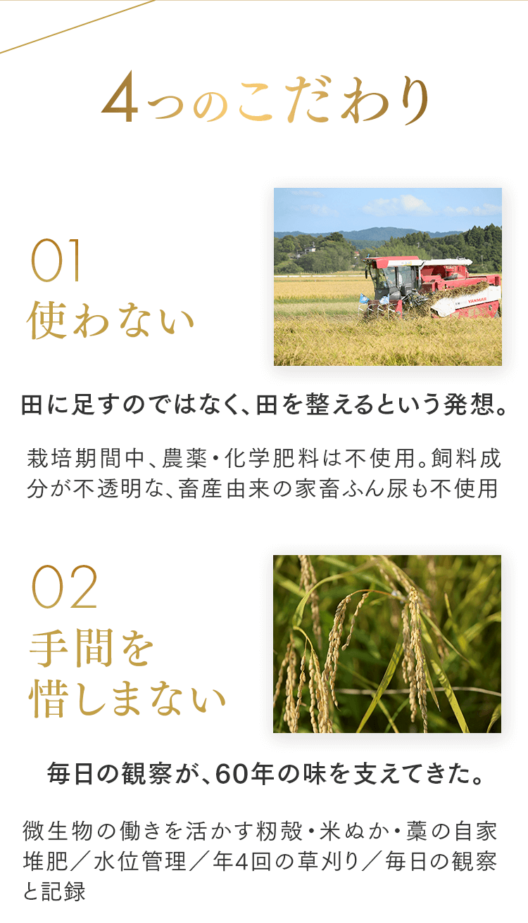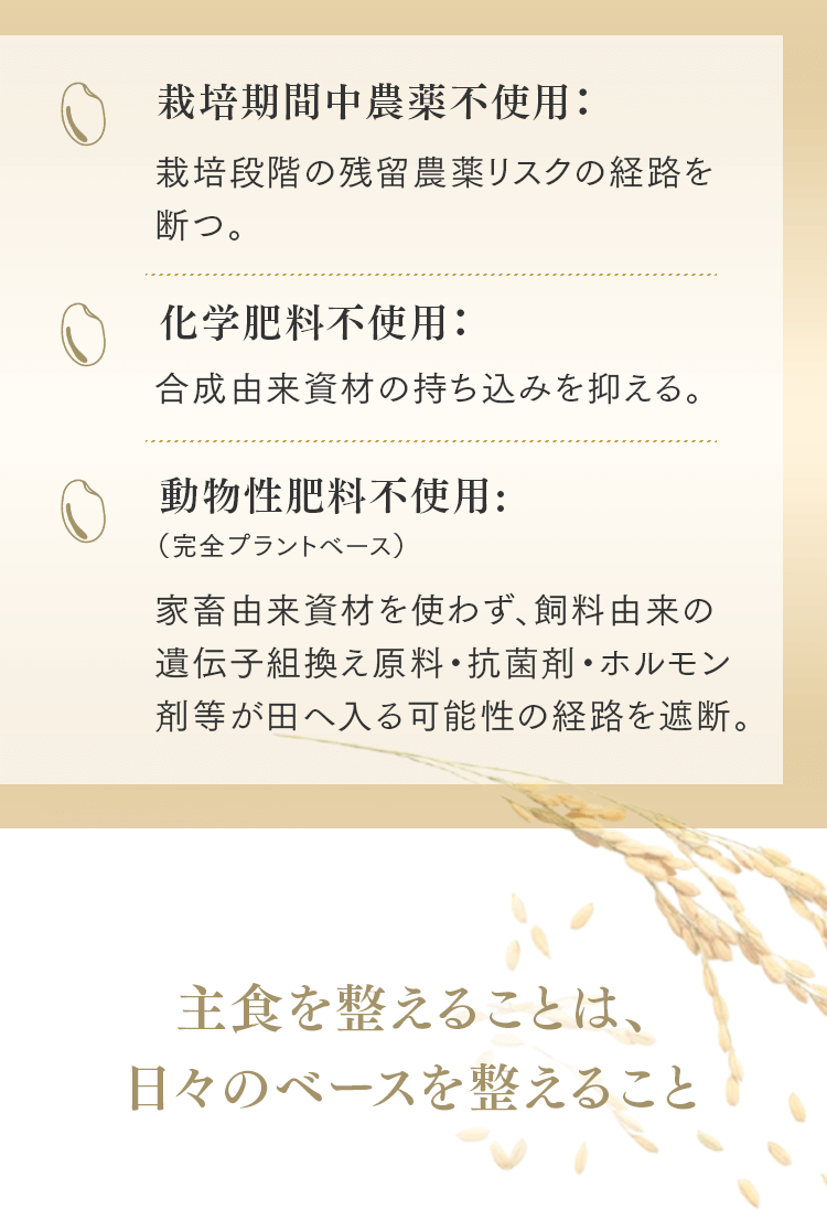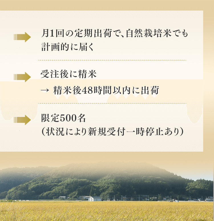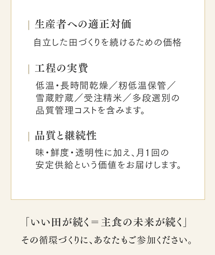 まずは5㎏で体験する → 月500名の今月枠を確保する → まずは5㎏で体験する → 月500名の今月枠を確保する → FAQ Q. スキップできますか? A. 可能です。出荷予定日の8日前 23:59までにフォーム申請。期限後は対応できません。 Q. 解約はむずかしい? A. フォーム1枚で完了。出荷予定日の8日前 23:59までに申請ください。 Q. 配送はいつ? A. 受注後に精米し、精米後48時間以内に出荷。お届けは月1回の出荷スケジュールに沿って手配します。 Q. どこから届きますか? A. 生産者指定ロットを有機JAS小分け認証の精米工場で受注精米後に出荷します。 Q. 保存方法は? A. お米は生鮮食品です。開封後は涼所保管。高温期は密閉容器+冷蔵を推奨します。 Q. 品種は選べますか? A. 原則「今月の品種」をお届けします(白米/玄米は選択可)。同一収穫年の単一品種で、ブレンドは行いません。天候・在庫により変更となる場合があります。 Q. 肥料は何を使っていますか? A. 動物性由来不使用(プラントベース)。籾殻・米ぬか・藁など植物由来の資材で自家堆肥を仕込み、微生物の働きを活かしています。 Q. 価格の理由を教えてください A. 共同出荷や公的補助に依存しない独立経営の田からお届けしています。生産者へは適正な対価を、工程では低温保管・受注精米・多段選別などの実費をかけ、その分を正直に反映しています。良い田を未来へつなぐための循環の価格です。 重ねた時間を、今日の一膳へ まずは5㎏で体験する →