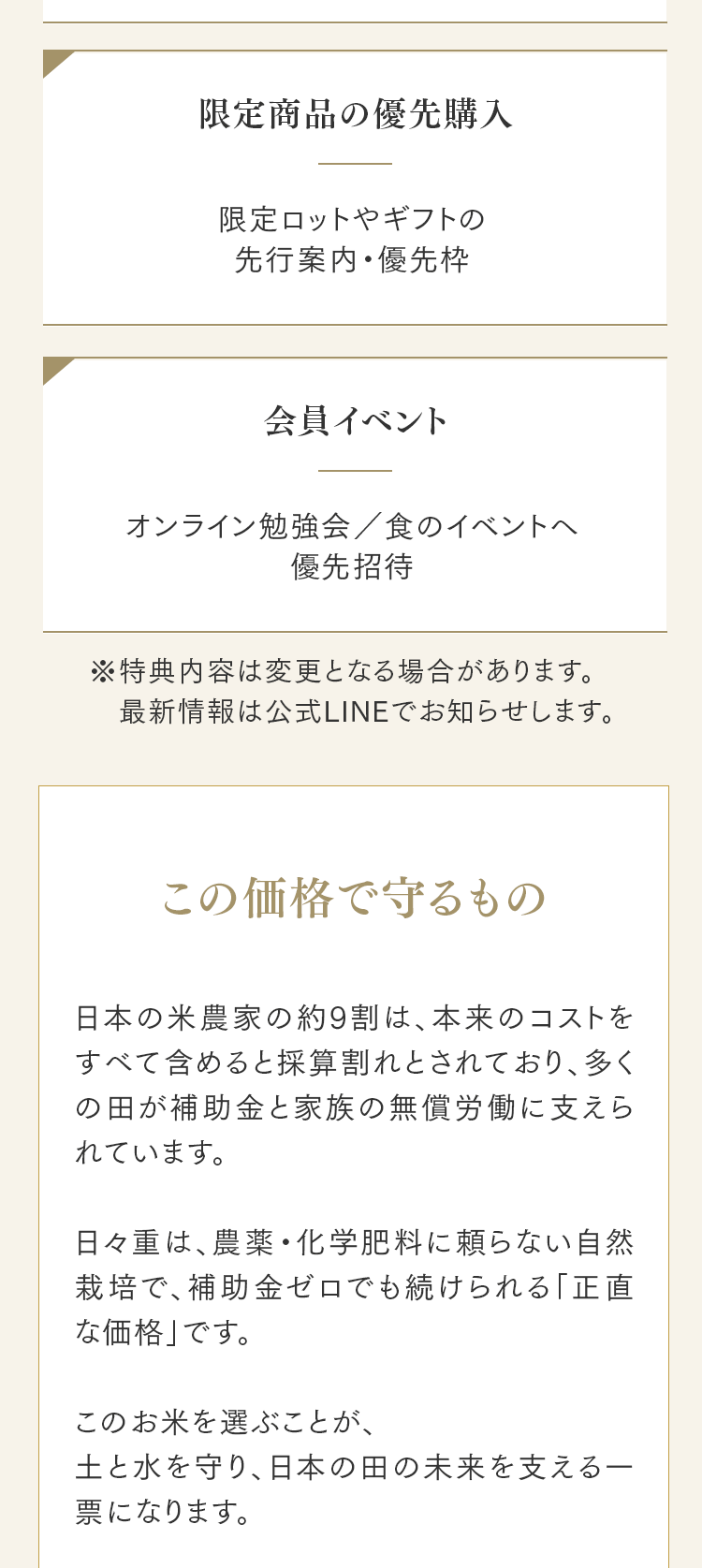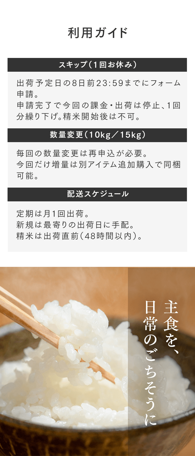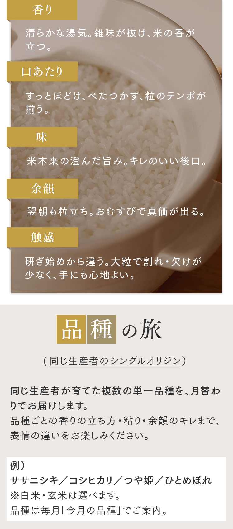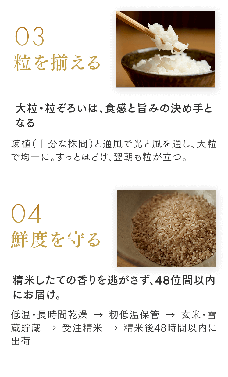 まずは5㎏で体験する → 月500名の今月枠を確保する → まずは5㎏で体験する → 月500名の今月枠を確保する → FAQ Q. スキップできますか? A. 可能です。出荷予定日の8日前 23:59までにフォーム申請。期限後は対応できません。 Q. 解約はむずかしい? A. フォーム1枚で完了。出荷予定日の8日前 23:59までに申請ください。 Q. 配送はいつ? A. 受注後に精米し、精米後48時間以内に出荷。お届けは月1回の出荷スケジュールに沿って手配します。 Q. どこから届きますか? A. 生産者指定ロットを有機JAS小分け認証の精米工場で受注精米後に出荷します。 Q. 保存方法は? A. お米は生鮮食品です。開封後は涼所保管。高温期は密閉容器+冷蔵を推奨します。 Q. 品種は選べますか? A. 原則「今月の品種」をお届けします(白米/玄米は選択可)。同一収穫年の単一品種で、ブレンドは行いません。天候・在庫により変更となる場合があります。 Q. 肥料は何を使っていますか? A. 動物性由来不使用(プラントベース)。籾殻・米ぬか・藁など植物由来の資材で自家堆肥を仕込み、微生物の働きを活かしています。 Q. 価格の理由を教えてください A. 共同出荷や公的補助に依存しない独立経営の田からお届けしています。生産者へは適正な対価を、工程では低温保管・受注精米・多段選別などの実費をかけ、その分を正直に反映しています。良い田を未来へつなぐための循環の価格です。 重ねた時間を、今日の一膳へ まずは5㎏で体験する →