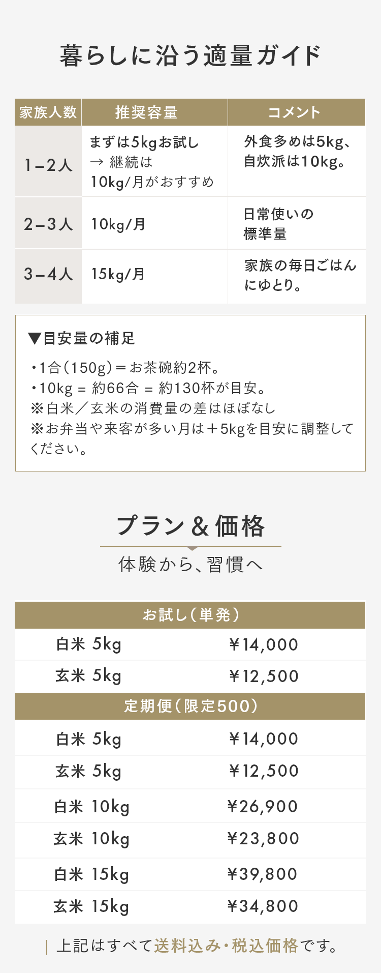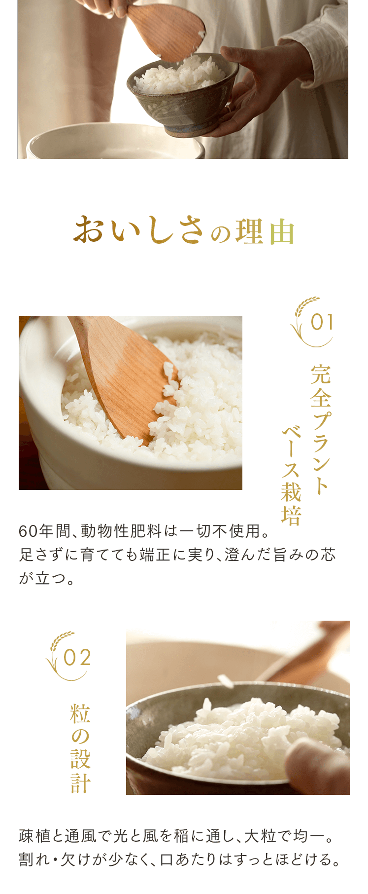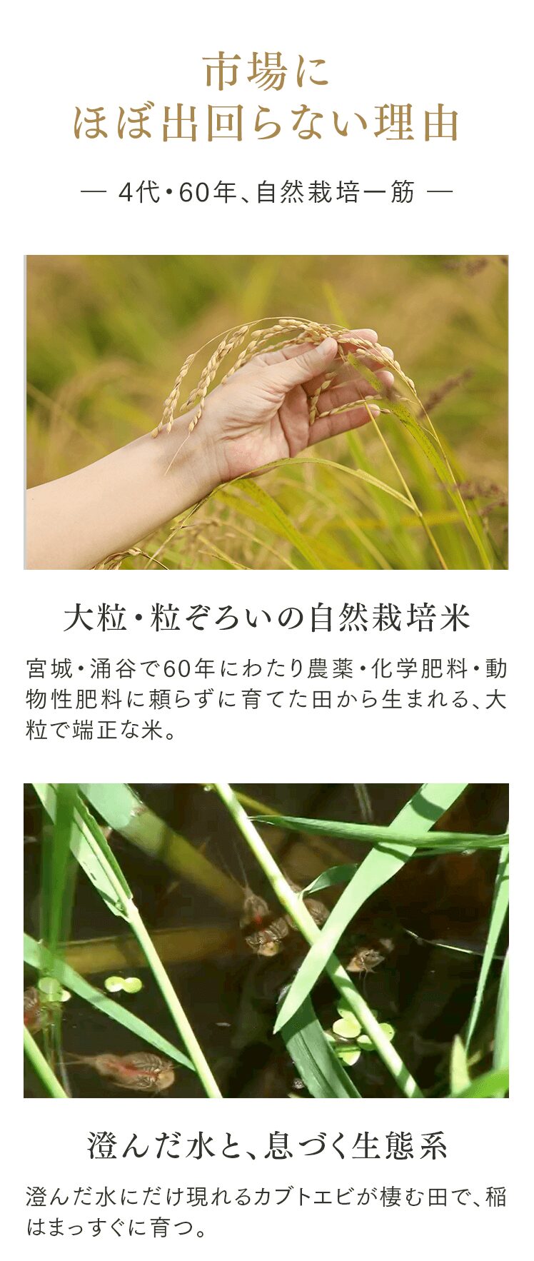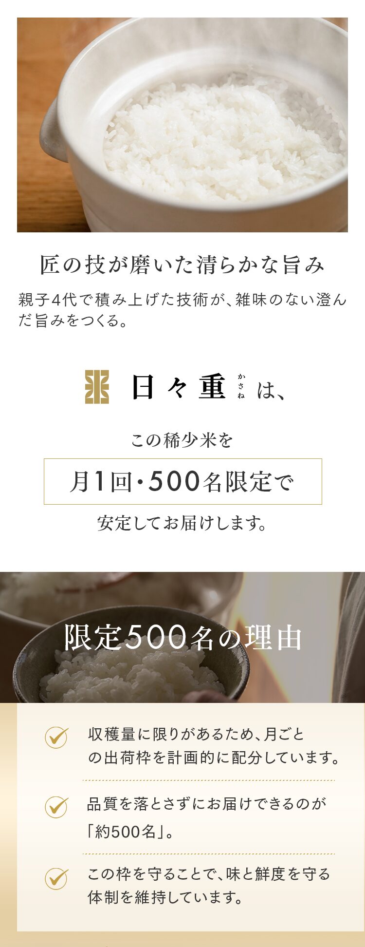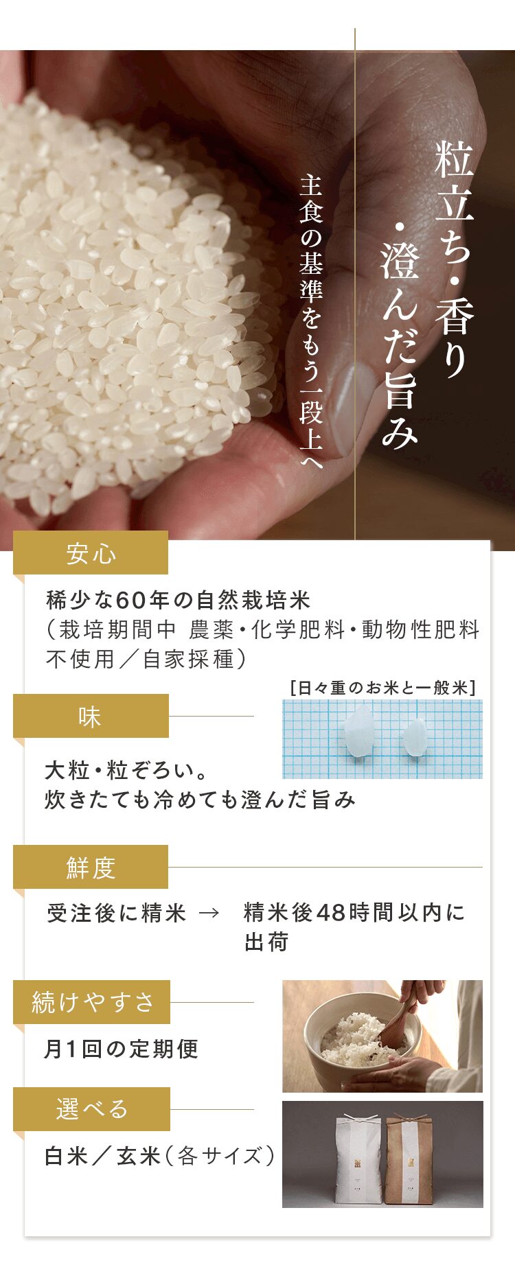 まずは5㎏で体験する → 月500名の今月枠を確保する → まずは5㎏で体験する → 月500名の今月枠を確保する → FAQ Q. スキップできますか? A. 可能です。出荷予定日の8日前 23:59までにフォーム申請。期限後は対応できません。 Q. 解約はむずかしい? A. フォーム1枚で完了。出荷予定日の8日前 23:59までに申請ください。 Q. 配送はいつ? A. 受注後に精米し、精米後48時間以内に出荷。お届けは月1回の出荷スケジュールに沿って手配します。 Q. どこから届きますか? A. 生産者指定ロットを有機JAS小分け認証の精米工場で受注精米後に出荷します。 Q. 保存方法は? A. お米は生鮮食品です。開封後は涼所保管。高温期は密閉容器+冷蔵を推奨します。 Q. 品種は選べますか? A. 原則「今月の品種」をお届けします(白米/玄米は選択可)。同一収穫年の単一品種で、ブレンドは行いません。天候・在庫により変更となる場合があります。 Q. 肥料は何を使っていますか? A. 動物性由来不使用(プラントベース)。籾殻・米ぬか・藁など植物由来の資材で自家堆肥を仕込み、微生物の働きを活かしています。 Q. 価格の理由を教えてください A. 共同出荷や公的補助に依存しない独立経営の田からお届けしています。生産者へは適正な対価を、工程では低温保管・受注精米・多段選別などの実費をかけ、その分を正直に反映しています。良い田を未来へつなぐための循環の価格です。 重ねた時間を、今日の一膳へ まずは5㎏で体験する →