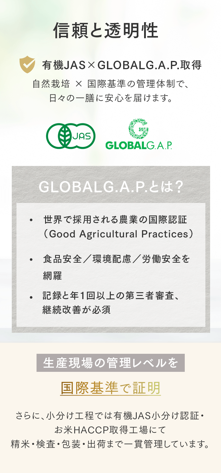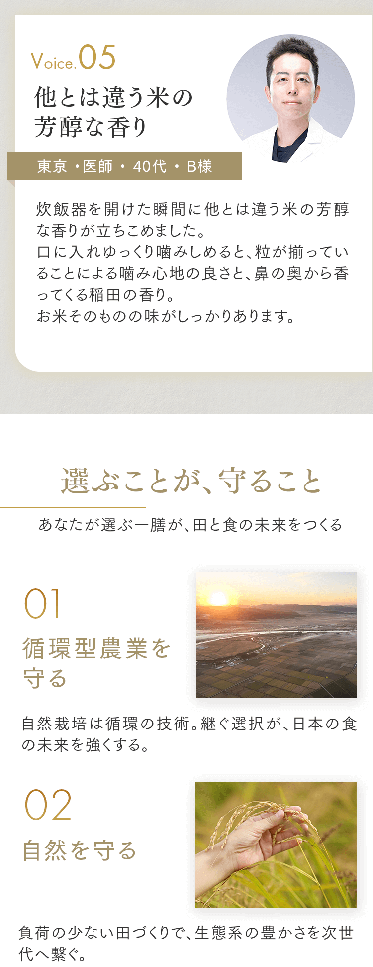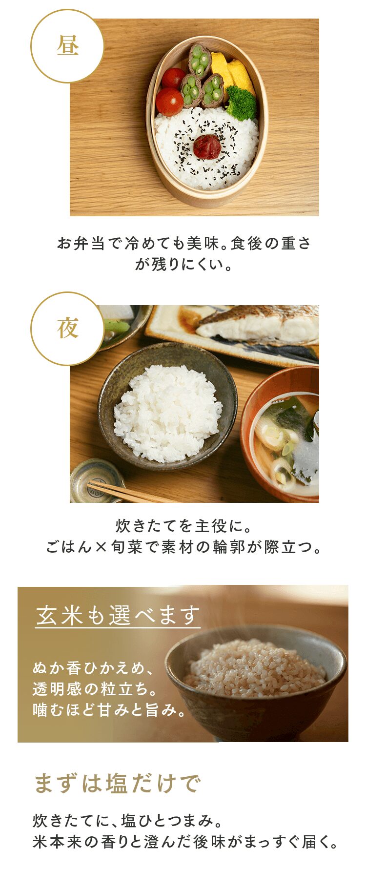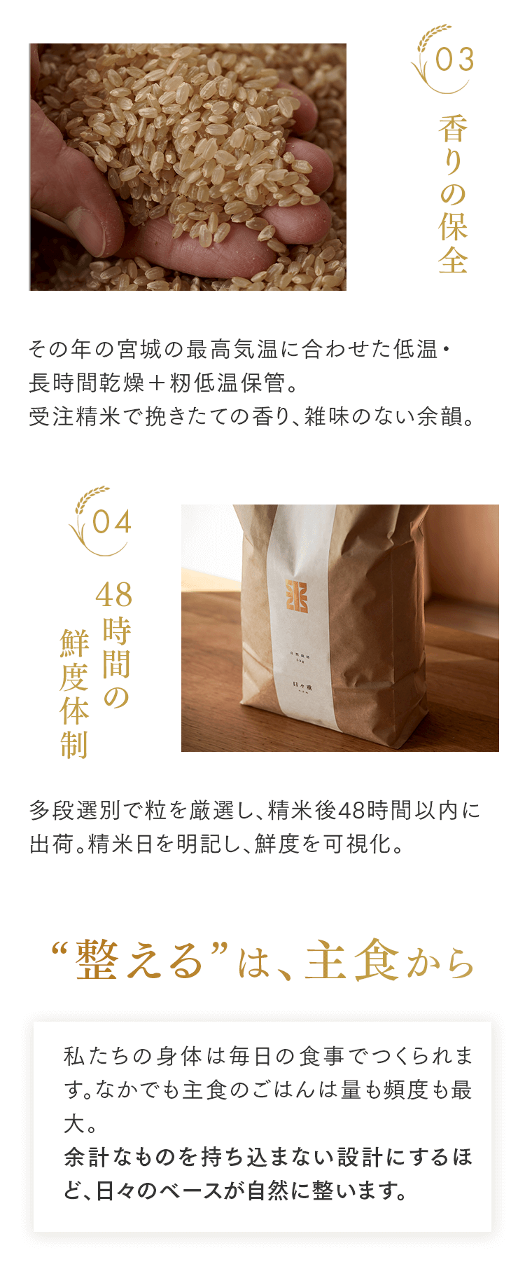 まずは5㎏で体験する → 月500名の今月枠を確保する → まずは5㎏で体験する → 月500名の今月枠を確保する → FAQ Q. スキップできますか? A. 可能です。出荷予定日の8日前 23:59までにフォーム申請。期限後は対応できません。 Q. 解約はむずかしい? A. フォーム1枚で完了。出荷予定日の8日前 23:59までに申請ください。 Q. 配送はいつ? A. 受注後に精米し、精米後48時間以内に出荷。お届けは月1回の出荷スケジュールに沿って手配します。 Q. どこから届きますか? A. 生産者指定ロットを有機JAS小分け認証の精米工場で受注精米後に出荷します。 Q. 保存方法は? A. お米は生鮮食品です。開封後は涼所保管。高温期は密閉容器+冷蔵を推奨します。 Q. 品種は選べますか? A. 原則「今月の品種」をお届けします(白米/玄米は選択可)。同一収穫年の単一品種で、ブレンドは行いません。天候・在庫により変更となる場合があります。 Q. 肥料は何を使っていますか? A. 動物性由来不使用(プラントベース)。籾殻・米ぬか・藁など植物由来の資材で自家堆肥を仕込み、微生物の働きを活かしています。 Q. 価格の理由を教えてください A. 共同出荷や公的補助に依存しない独立経営の田からお届けしています。生産者へは適正な対価を、工程では低温保管・受注精米・多段選別などの実費をかけ、その分を正直に反映しています。良い田を未来へつなぐための循環の価格です。 重ねた時間を、今日の一膳へ まずは5㎏で体験する →